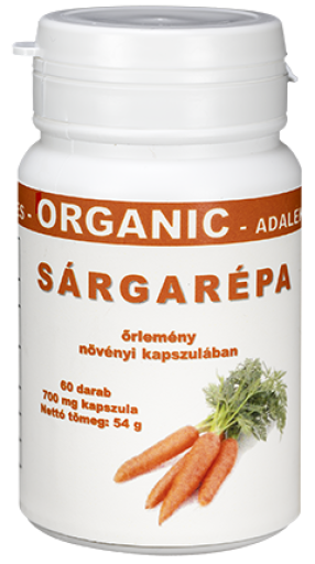 Összetevők: 100 % szárított sárgarépa porítva zselatin kapszulában (A sárgarépa ( 30-40 C-on) leszárított őrlemény, töltöttük zselatin kapszulába.)
