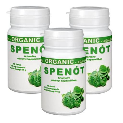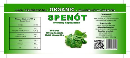 Összetevők: 100 % szárított spenót porítva zselatin kapszulában (A spenót ( 30-40 C-on) leszárított őrleményt, töltöttük zselatin kapszulába.)